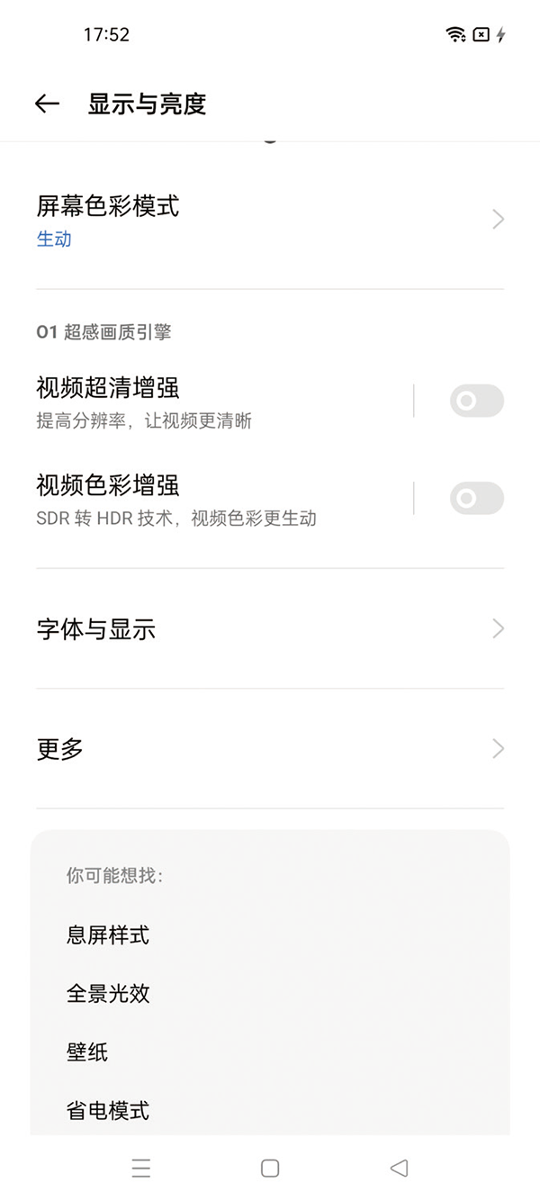 除了專(zhuān)門(mén)為游戲玩家?guī)?lái)升級(jí)外,真我GT Neo2針對(duì)愛(ài)看視頻的用戶也有驚喜送上。其搭載的O1超感畫(huà)質(zhì)引擎可以提供視頻超清增強(qiáng)和視頻色彩增強(qiáng)兩項(xiàng)專(zhuān)業(yè)功能,前者可以提高視頻分辨率,讓觀感更清晰。后者則是采用了SDR轉(zhuǎn)HDR技術(shù),讓視頻呈現(xiàn)的色彩更生動(dòng)。在顯示設(shè)置中的“更多”設(shè)置中,用戶還能打開(kāi)HDR視頻高亮模式。