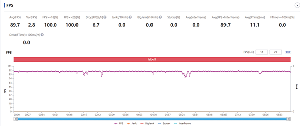 在我們的測試中,realme真我GT Neo2充分“預熱”后,第三局的《王者榮耀》平均幀率為89.7fps,游戲過程中絲毫沒有卡頓的情況。
