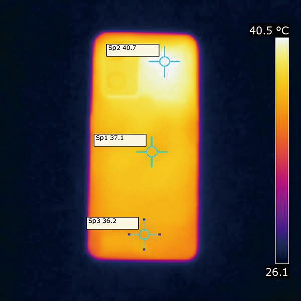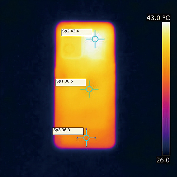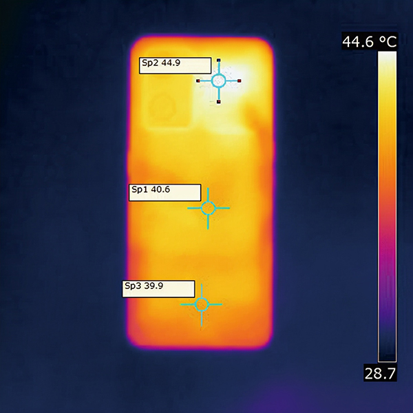 在機身的溫度控制上,我們在室溫27℃的環(huán)境下玩了三局《王者榮耀》,每局后的機身溫度最高溫度分別達到38.4℃、40.7℃、43.4℃。緊接著在半小時高畫質(zhì)《原神》后,機身最高溫度為44.9℃,相比“火龍888”動輒50℃的溫度來說要好上不少。