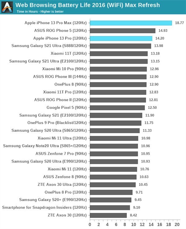 接下來是高刷手機(jī)之間的對決,13 Pro系列都開啟120Hz,結(jié)果iPhone 13 Pro Max跑出了18.77小時(shí)的好成績。
