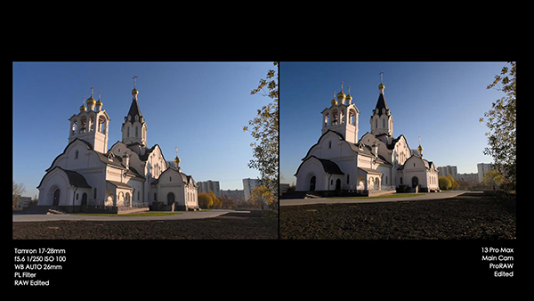 第一組照片由于相機(jī)的光圈和iPhone 13 Pro Max之間的不同,所以盡量將建筑物擺放在照片中間的位置,由于建筑物較遠(yuǎn)所以只能看整體的效果區(qū)別。索尼A7SIII拍攝的照片中地面的亮度較高,iPhone 13 Pro Max拍攝的照片中地面的亮度較低一些。