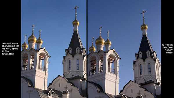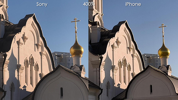 不過將照片放大400%之后,索尼A7SIII和iPhone 13 Pro Max之間的照片效果區(qū)別則十分明顯。索尼A7SIII拍攝的照片亮度更高一些,并且建筑物表面的顏色偏黃色多一些。iPhone 13 Pro Max拍攝的照片亮度低一些,建筑物表面的顏色偏白色多一些。另外屋頂金色的裝飾物,索尼A7SIII拍攝的照片中出現(xiàn)了較為嚴(yán)重的反光現(xiàn)象,iPhone 13 Pro Max則將曝光度壓制住了,細(xì)節(jié)表現(xiàn)更多一些。