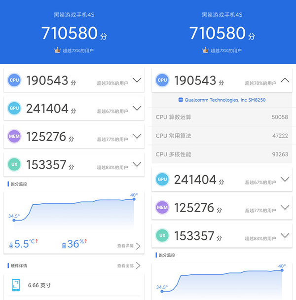 黑鯊4S采用了備受廣大手游玩家好評的高通驍龍870處理器平臺,安兔兔跑分可以達(dá)到71萬左右,性能上超過了去年的旗艦驍龍865。驍龍870移動平臺采用7nm制作工藝,CPU使用了Kryo 585八核架構(gòu),主頻最高提升至3.2GHz;GPU采用Adreno 650;采用第五代AI引擎,支持15 TOPS算力的也帶來更低功耗;同時支持Wi-Fi6及藍(lán)牙5.1音頻技術(shù),提升了網(wǎng)絡(luò)和無線設(shè)備的連接穩(wěn)定性。