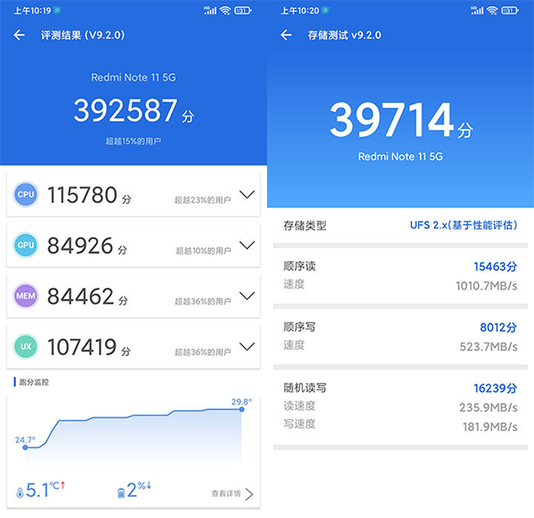 這里簡單說一下聯(lián)發(fā)科天璣810處理器,這顆處理器采用臺積電6nm工藝制造,CPU架構(gòu)為2*A76大核+6*A55小核,支持HyperEngine 2.0游戲引擎,可通過智能負(fù)載調(diào)控引擎平衡性能和功耗。在這套配置下,紅米Note11的安兔兔評測跑分成績?yōu)?9萬分,性能表現(xiàn)不錯,所有日常應(yīng)用的使用流暢不卡。