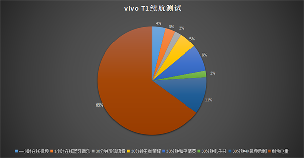 我們也對vivo T1進行了續(xù)航實測,結(jié)果顯示,在手機滿電狀態(tài)下,經(jīng)過30分鐘在線視頻、30分鐘在線藍牙音樂、1小時《王者榮耀》等共計4個半小時的重度使用,vivo T1最終剩余電量65%,實際表現(xiàn)可以說非常出色,基本告別了邊玩邊充的情況,滿足一整天使用還是很輕松的。