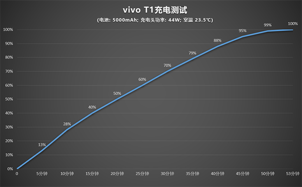 尤其是vivo T1為了提升電池安全為Type-C接口內(nèi)觸角采用了稀有“銠釕”金屬鍍膜,以防受潮而引起的接口腐蝕短路等問(wèn)題。接下來(lái),我們看看為vivo T1充滿電共需要多久?(我們將手機(jī)電量耗盡,每五分鐘記錄一次數(shù)據(jù))