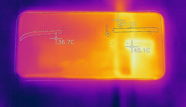 安兔兔兩輪跑分下來,機身背面最高溫度37℃;《王者榮耀》120幀模式下,機身最高溫度41度?!对瘛吩谟螒驕y試過程中,機身背面的最高溫度為45℃上下。和之前黑鯊4S 50℃左右的發(fā)熱反而要溫和許多。