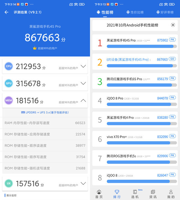 作為下半年的真旗艦,黑鯊4S Pro理所當(dāng)然的用上了驍龍888 Plus,以及LPDDR5和UFS 3.1的旗艦存儲(chǔ)。相較黑鯊4S的驍龍870,可以應(yīng)對更高幀率和更高畫質(zhì)下的游戲畫面。室溫下安兔兔跑分輕松上86萬,位列榜首。