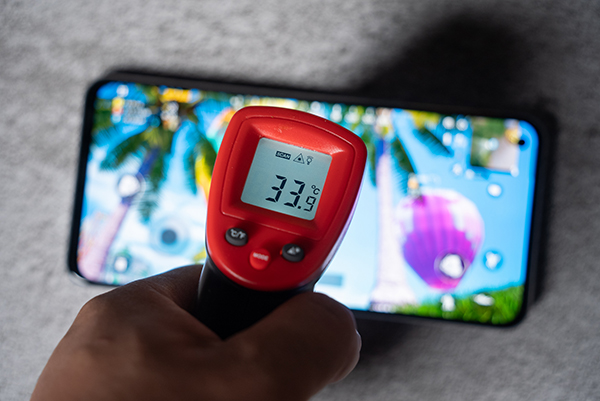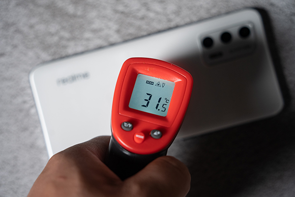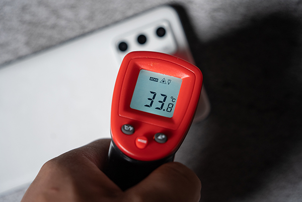 接著我們使用溫槍測(cè)試了手機(jī)表面溫度。理論上,真我GT Neo2T采用了由內(nèi)部銅管和不銹鋼外殼的雙層結(jié)構(gòu)組成的3D鋼化液冷VC散熱方案,能帶來(lái)更好的導(dǎo)熱效率。
