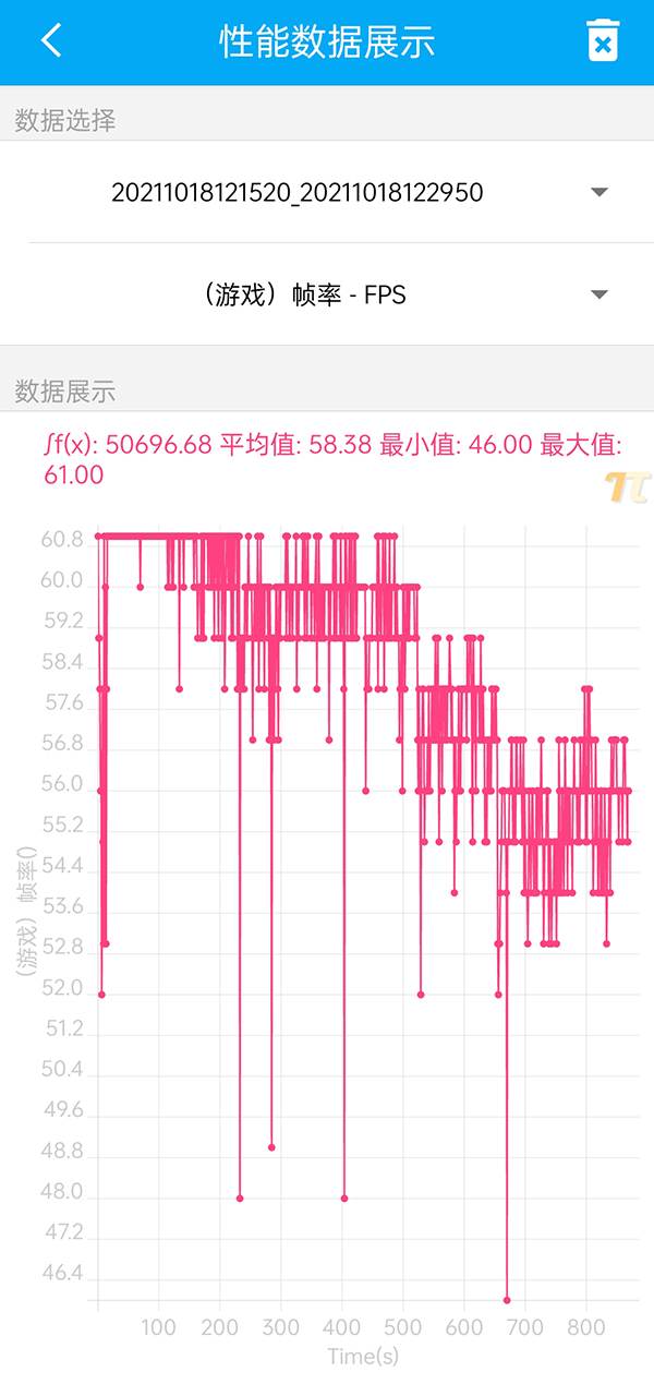 15分鐘的游戲過(guò)程中,真我GT Neo2T可以看到出現(xiàn)了2次降頻,不過(guò)整體的降頻幅度非常小,最終也得到了58.38幀的平均幀率,這一表現(xiàn)非常不錯(cuò)了。