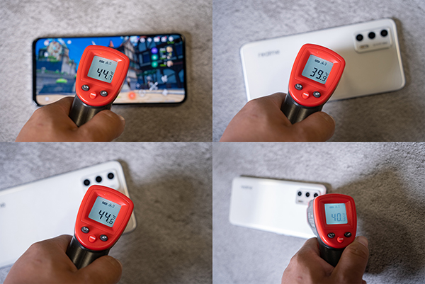 接著我們使用溫槍再次測(cè)量了手機(jī)表面溫度,屏幕中心溫度為44.7℃,背部中心溫度為39.9℃,SoC處的溫度為44.6℃,邊框最高溫度為40.3℃,熱感相對(duì)而言就比較明顯了??紤]到這是在打開(kāi)GT模式和電競(jìng)模式的情況下得到的成績(jī),而如果選擇不開(kāi)啟這兩個(gè)模式雖然幀率會(huì)有一些下降,但是手機(jī)表面溫度也會(huì)大幅下降,至于這之間的取舍就看用戶自己了。