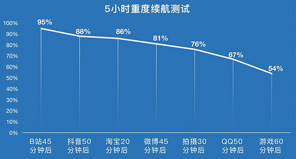 那么,vivo Y76s的實際續(xù)航表現(xiàn)如何呢?筆者按照在線重度續(xù)航測試模型對其進(jìn)行了5小時的重度續(xù)航測試。實測結(jié)果如下: