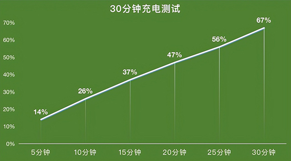 根據(jù)實測結果,vivo Y76s在30分鐘內(nèi)即可將手機電量從0充至67%,這樣的速度在同級別機型中無疑是第一梯隊的水平。而用戶只需在洗漱吃飯等碎片時間插上充電器,即可讓手機快速回血。