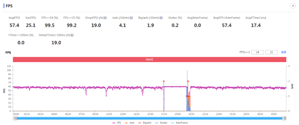 王者榮耀-高幀率+超高分辨率模式,游戲32分鐘,平均幀率為57.4fps。