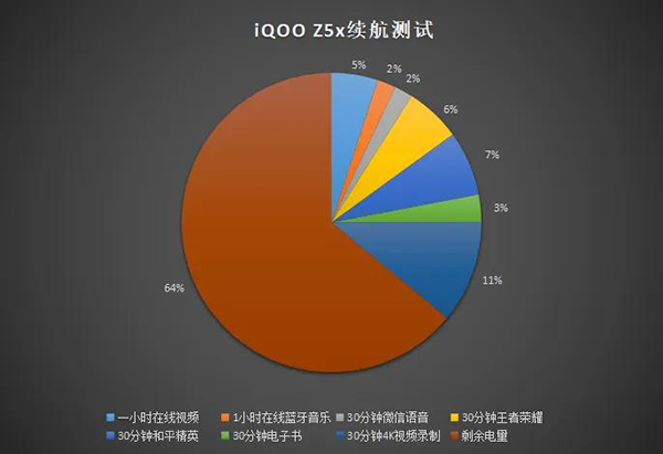 針對(duì)該機(jī)的續(xù)航能力,我還進(jìn)行了一番測(cè)試。在實(shí)際測(cè)試過(guò)程中,我對(duì)iQOO Z5x的耗電數(shù)據(jù)進(jìn)行了記錄。從下面的數(shù)據(jù)圖可見(jiàn),當(dāng)iQOO Z5x進(jìn)行了半小時(shí)《王者榮耀》游戲之后,手機(jī)僅消耗了6%的電量,當(dāng)它進(jìn)行了一小時(shí)在線藍(lán)牙音樂(lè)之后,手機(jī)也僅掉了2%電量,令我相當(dāng)驚喜??傮w來(lái)看,這款手機(jī)的續(xù)航能力是相當(dāng)不錯(cuò)的。
