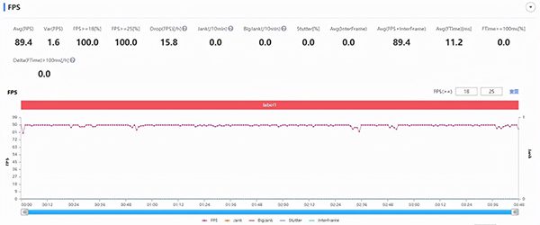 這里筆者選取了《使命召喚手游》、《和平精英》兩款游戲,可以看到,在90fps允許的最高畫質(zhì)下,兩款游戲幀率表現(xiàn)都十分穩(wěn)定,平均幀率基本都維持在90fps,而且在60分鐘游戲后,依舊未出現(xiàn)掉幀、卡頓等情況。