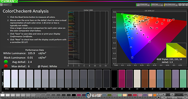自然模式色溫7522K,覆蓋95.7%sRGB色域,平均灰階偏離4,sRGB色域下平均色彩偏離2.4