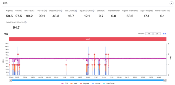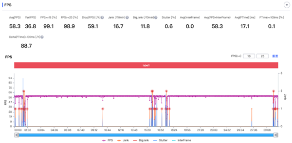 我們在室溫25度,全程連接wifi以及手動50%亮度的條件下,選用時下最熱門的英雄聯盟和王者榮耀兩款手游,分別進行了各半個小時的最高畫質游戲測試,最后得出的兩款游戲的幀率如下圖所示: