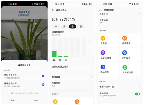 再比如在隱私保護方面,ColorOS12同樣升級了不少看點,包括應(yīng)用行為記錄、照片安全分享、敏感權(quán)限提醒、模糊定位等等。以「照片安全分享」為例,通過相冊分享圖片或者是視頻時,可以選擇去掉圖片以及視頻的位置信息和數(shù)據(jù),無須擔(dān)心隱私泄露的風(fēng)險。