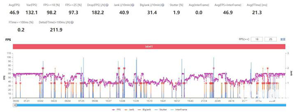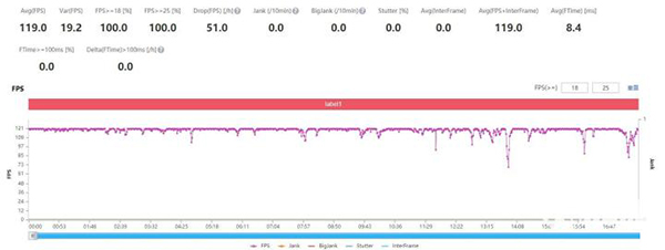 榮耀60 Pro在該模式下,一整局游戲的平均幀數(shù)高達(dá)119幀,游戲中的對(duì)線、發(fā)育、GANK時(shí)期穩(wěn)定性表現(xiàn)均十分出色,后期的十人開團(tuán)確實(shí)偶有掉幀情況,但也絕不會(huì)出現(xiàn)卡頓情況。