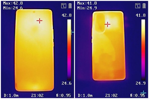 在25度左右的室溫環(huán)境,連續(xù)玩30分鐘120幀《王者榮耀》游戲后,測(cè)得正面最高溫度為42.8度,背面最高溫度為41.8度。機(jī)身溫度不高,對(duì)手感的影響不大,只有溫?zé)岣小?