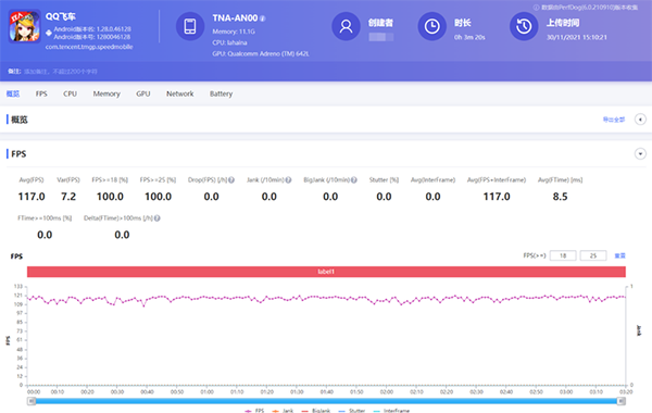 《QQ飛車》也支持120幀高幀模式,軟件記錄到的平均幀數(shù)為117幀,同樣能夠體驗(yàn)到非常流暢的高幀游戲畫面。