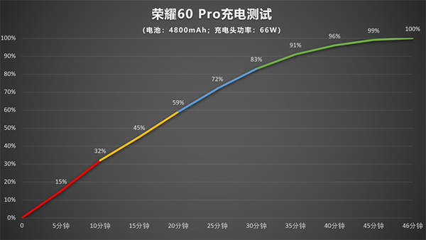 在手機(jī)電量耗盡自動關(guān)機(jī)后開始充電測試,10分鐘就能達(dá)到32%的電量,30分鐘達(dá)到83%的電量,達(dá)到100%電量用時(shí)46分鐘。即使配備了4800mAh大電池,也不用花費(fèi)很長充電時(shí)間,平常碎片化時(shí)間充電也更有實(shí)用意義。