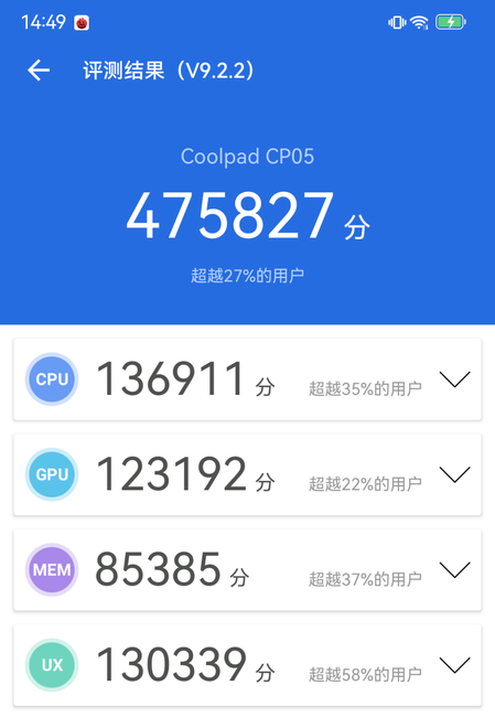為了直觀的將酷派COOL 20 Pro的性能表現(xiàn)展現(xiàn)給大家,我們首先對(duì)其進(jìn)行了安兔兔平臺(tái)的跑分測(cè)試,最終475827分的總成績(jī),說明天璣900給予了酷派COOL 20 Pro足夠的性能支撐。