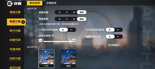 射擊類游戲的《王牌戰(zhàn)場》,我們同樣把競技戰(zhàn)場和王牌戰(zhàn)場的游戲畫質(zhì)拉到最高,并關(guān)掉自動降低畫質(zhì)和幀率。
