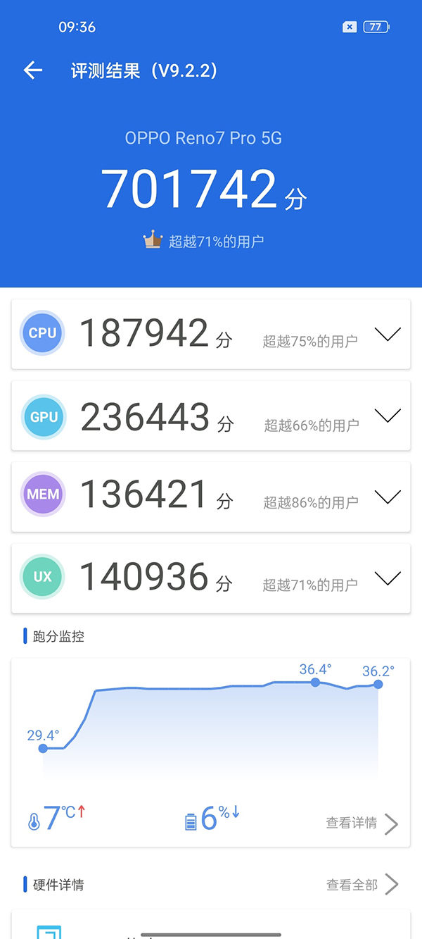 經(jīng)過實際測試,OPPO Reno7 Pro的安兔兔跑分為701742,和前不久發(fā)布的realme GT Neo2T相差不大,充分發(fā)揮了天璣1200的性能,溫度提升尚可接受,但是相比追求性能的游戲手機來說,還是差了點意思。