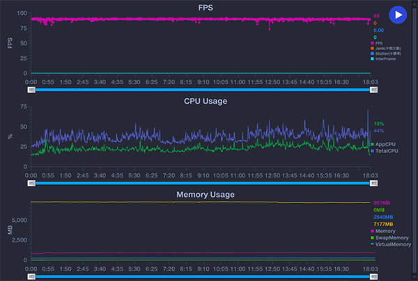 我們也可以從幀率監(jiān)測(cè)中看到Reno7 Pro的從容,整個(gè)監(jiān)測(cè)過程中,畫面基本保持在90Hz左右,波動(dòng)非常小,CPU的占用率波動(dòng)范圍也是較為平緩。