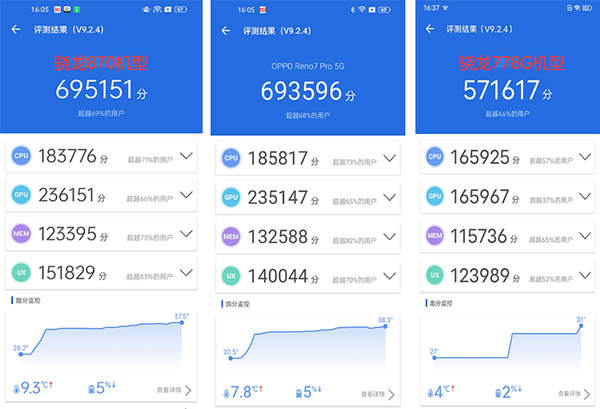 通過最新版安兔兔的跑分我們可以看到,OPPO Reno7 Pro所采用的天璣1200-MAX對(duì)比驍龍870分?jǐn)?shù)雖然低了一點(diǎn),但相當(dāng)接近,在分?jǐn)?shù)上和驍龍870機(jī)型差距不大,也可以從側(cè)面反映了在日常使用及大部分的游戲上,采用天璣1200-MAX的OPPO Reno7 Pro也有類似驍龍870機(jī)型的使用效果。