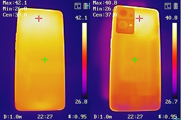 一番測(cè)試過(guò)后,Reno7 Pro的正面最高溫度僅42.1°C,背面最高僅40.8°C,并且最熱點(diǎn)集中在機(jī)身中部而非邊框處,并不會(huì)對(duì)握持帶來(lái)明顯不適。
