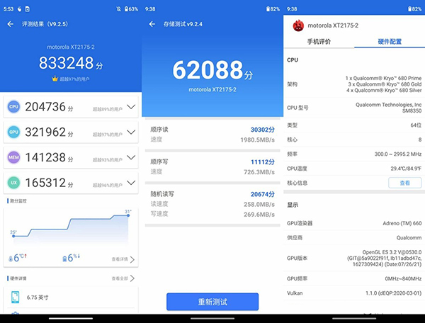 跑分來(lái)說(shuō),目前的旗艦手機(jī)里面,毋庸置疑是第一梯隊(duì)的,高通驍龍888+芯片的性能表現(xiàn),非常強(qiáng)勁。另外,數(shù)據(jù)的順序讀寫(xiě)速度也非???,因?yàn)閙oto edge S30搭載的是LPDDR5+UFS3.1的組合,為手機(jī)的運(yùn)行速度和續(xù)航提供了硬件基礎(chǔ)。