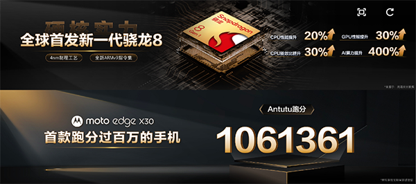 從官方的跑分數據來看,摩托羅拉edge X30的安兔兔性能跑分成績達到了106萬,這是目前安卓陣營中首款跑分過百萬的手機。 而從已上手媒體的跑分成績來看,基本上都能達到100萬左右,比驍龍888的提升明顯很多,基本上在10%往上幅度。