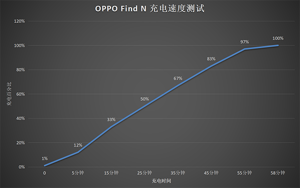 實(shí)測(cè),利用原裝有線充電器5分鐘可以從1%充至12%、15分鐘可以充至33%、25分鐘可以充至50%、35分鐘可以充至67%、45分鐘可以充至83%、55分鐘可以充至97%,充至100%大概需要58分鐘。前半段充電速度還不錯(cuò),55分鐘之后會(huì)出現(xiàn)明顯降速。