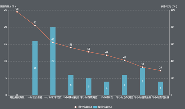 可以看出,榮耀X30從電量98%開(kāi)始,經(jīng)過(guò)連續(xù)8輪共計(jì)5小時(shí)高強(qiáng)度續(xù)航實(shí)測(cè)后,還剩下29%的電量,這樣的表現(xiàn)相當(dāng)?shù)牟诲e(cuò)了。而在一些分項(xiàng)目耗電結(jié)果中顯示,最為常見(jiàn)的B站和抖音,半小時(shí)耗電分別僅6%和4%,即使是最為耗電的和平精英,經(jīng)過(guò)一個(gè)小時(shí)重度游戲之后,也只是耗掉了20%的電量。