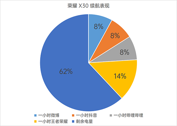 按照我們這份圖里的成績(jī)換算一下,不難推測(cè)出榮耀X30在在線(xiàn)圖文閱讀或者視頻播放領(lǐng)域,能堅(jiān)持超過(guò)12小時(shí)的持續(xù)使用??紤]到大家每天使用這些APP的時(shí)間大多在三至四小時(shí)之內(nèi),筆者可以給它一個(gè)“日常使用下能堅(jiān)持兩天一充”的推測(cè)結(jié)論。