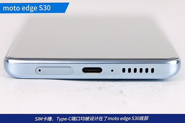 SIM卡槽、Type-C端口均被設(shè)計(jì)在了摩托羅拉edge S30底部,使用者可通過取卡針打開卡槽,安裝或取出SIM卡。這里需要注意的是,雙卡雙待的摩托羅拉edge S30僅支持Nano SIM卡,可支持5G網(wǎng)絡(luò)。SIM卡槽右側(cè)設(shè)計(jì)有Type-C接口,可用于充電、數(shù)據(jù)傳輸、連接耳機(jī),為使用帶來便利。