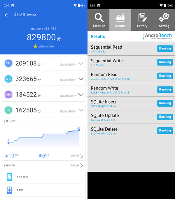 摩托羅拉edge S30的整機(jī)跑分達(dá)到了82萬+這也是目前主流的旗艦水準(zhǔn),而UFS3.1的性能在Write Tubro的加持下也來到了,讀取1903.28MB/S的水準(zhǔn),比起主流的1700MB/S還是有明顯優(yōu)勢(shì)的,寫入則達(dá)到了718.13MB/S。