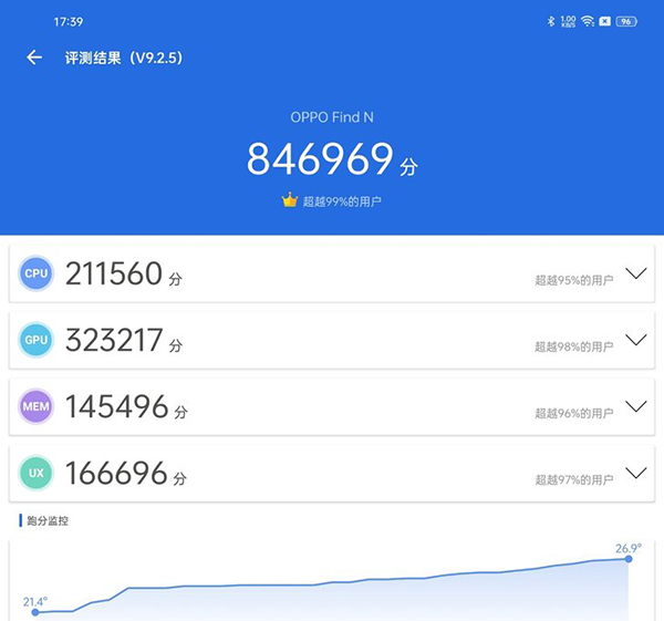 想要暢玩游戲,優(yōu)秀的硬件性能必不可少。作為OPPO首款折疊旗艦機,OPPO Find N在這方面當然不含糊。在這個性能配置方面,OPPO Find N采用驍龍888處理器+UFS 3.1存儲+LPDDR5內存組合,提供旗艦級的性能支持。跑分上,OPPO Find N安兔兔跑分達到84萬+。