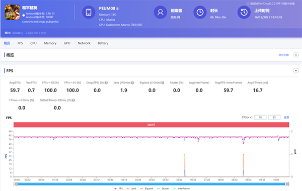 實際體驗上,我們選取了《王者榮耀》、《和平精英》、《英雄聯(lián)盟手游》三款游戲進行實測。由PerfDog軟件記錄到的平均幀數(shù)分別為59.9幀、59.7幀、59.9幀,三款游戲全程幀率波動都很小,幀率幾乎是一條直線,玩這類型游戲不用擔心流暢度問題,具體幀數(shù)表現(xiàn)如下圖。