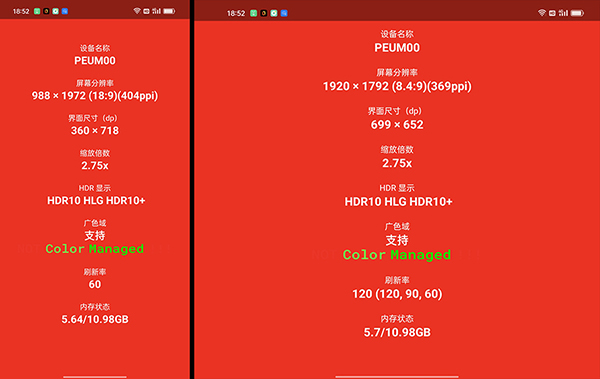 內(nèi)屏的分辨率為1792 × 1920,并且支持最高120Hz的可變刷新率,由于幾乎看不到內(nèi)屏的折痕,加之內(nèi)屏是三星的E5發(fā)光材料打造的,因此屏幕觀感體驗(yàn)非常出色。而且內(nèi)屏外屏的操作可以很自然的銜接起來(lái),內(nèi)屏折起后外屏只需向上一滑就能繼續(xù)操作之前內(nèi)屏的畫(huà)面。不過(guò)有些遺憾的是外屏采用的是京東方的屏幕,并且只支持60Hz的刷新率,因此內(nèi)外屏在流暢度的體驗(yàn)上是有一些割裂感的,而且京東方屏幕由于像素排列的原因,顯示效果比起三星E5的內(nèi)屏要遜色一些,所以個(gè)人感覺(jué)外屏除了聊天打電話之外,基本不怎么會(huì)用,哪怕是微博或朋友圈這類(lèi)常用的豎屏信息流,也都是內(nèi)屏體驗(yàn)更加流暢,如果外屏也有高刷的話,折疊使用的體驗(yàn)將會(huì)更好一些。