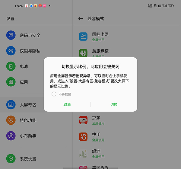 像百度地圖和剪映等APP在安裝完成后,手機(jī)默認(rèn)不會(huì)內(nèi)屏全尺寸顯示,這時(shí)候可以在設(shè)置菜單中的大屏專(zhuān)區(qū)對(duì)應(yīng)用的兼容模式調(diào)整為全屏使用就行了,同時(shí)官方也提示了如果全屏顯示有異常,那就使用外屏或調(diào)整顯示比例使用。