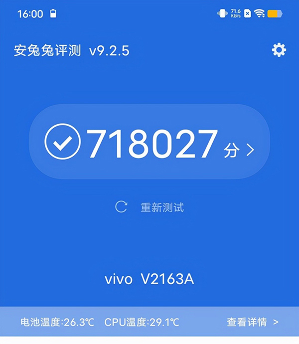 從跑分的角度來看,我們手中的這臺vivo S12 Pro在安兔兔中跑到了718027分的成績,與官方此前宣傳的數(shù)據(jù)相差不大,這也讓我們對天璣1200的能力有了一個清晰的認知。
