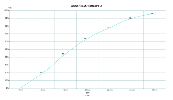 66W閃充是2021旗艦手機(jī)的標(biāo)配,iQOO Neo5S采用雙電芯串聯(lián)方案和FFC技術(shù),在充電前后期保持較快的速度,速度快還不燙手。筆者將iQOO Neo5S充電時半小時的電量變化做了一個統(tǒng)計(jì)圖,大家可以直觀的感受一下。
