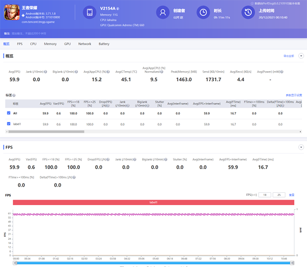 iQOO Neo5S搭載的獨(dú)顯芯片 Pro也給我留下了深刻的印象,這枚芯片不僅帶來(lái)了出色的游戲幀率穩(wěn)定性,而且還能幫助手機(jī)實(shí)現(xiàn)游戲插幀,讓用戶可以獲得更加流暢的游戲視覺(jué)體驗(yàn)。在實(shí)測(cè)環(huán)節(jié)中,我選擇了《王者榮耀》來(lái)測(cè)試iQOO Neo5S的游戲幀率穩(wěn)定性,在開啟提升幀率模式之后,我發(fā)現(xiàn)它全程都有著流暢的運(yùn)行表現(xiàn),而且?guī)蕡D顯示其幀率表現(xiàn)很穩(wěn)定,游戲全程都沒(méi)有出現(xiàn)較大的幀率波動(dòng),平均幀率為59.9幀。需要注意的是,在開啟插幀后,Perfdog測(cè)出的數(shù)據(jù)只顯示了一半的幀數(shù),實(shí)際幀數(shù)為120幀。