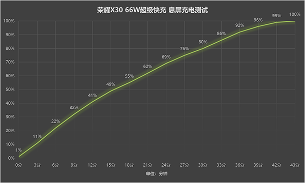 息屏充電部分實(shí)測(cè),榮耀X30整個(gè)充電曲線保持平穩(wěn),僅用時(shí)15分鐘電量就達(dá)到了49%,將近一半電量。半小時(shí)電量達(dá)到80%,UI充滿時(shí)間為43分鐘,與官方數(shù)據(jù)基本吻合。