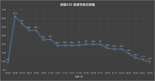 再來(lái)看看充電功率的曲線圖,在起始部分,榮耀X30的充電功率就達(dá)到了峰值60W以上。隨后在整機(jī)溫度上來(lái)后功率降到46W-35W的第二階段,高功率充電保持了10分鐘左右,電量已經(jīng)達(dá)到了約50%。隨后降到了28W充電功率,直到電量超過(guò)80%后,功率再次緩慢下降,直到最后充滿。