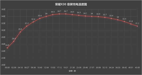 充電溫度表現(xiàn)部分,榮耀X30機(jī)身背面的溫度不超35度,前15分鐘是功率最高的時(shí)候溫升速度較快,當(dāng)電量超過(guò)50%后隨著充電功率的穩(wěn)步下降,機(jī)身表面溫度也隨之而降低,整體發(fā)熱控制符合預(yù)期。